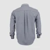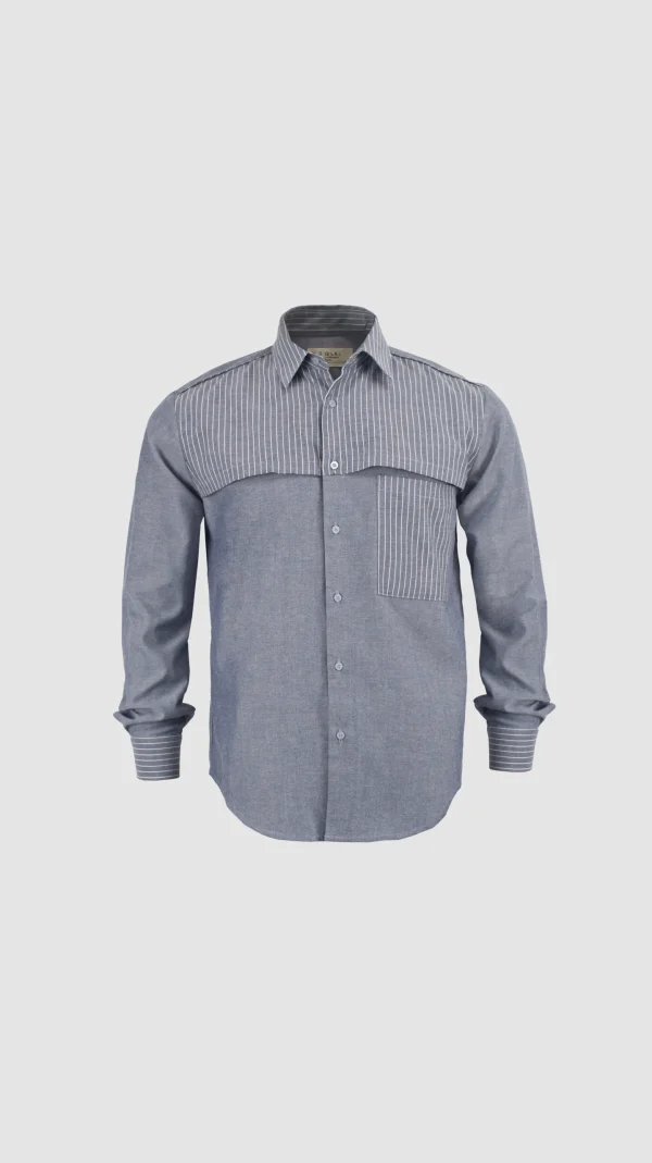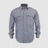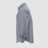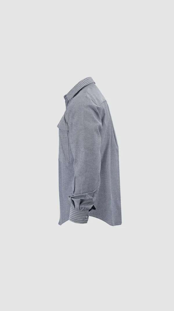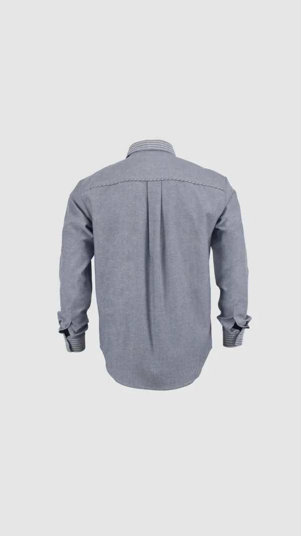 This shirt features a sophisticated design highlighted by a grey and white striped collar, adding a touch of elegance to any outfit, making it suitable for both casual and formal occasions.