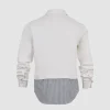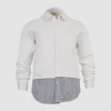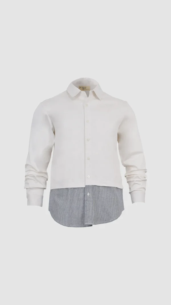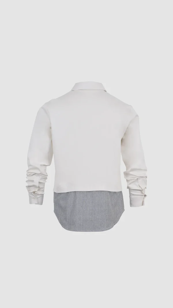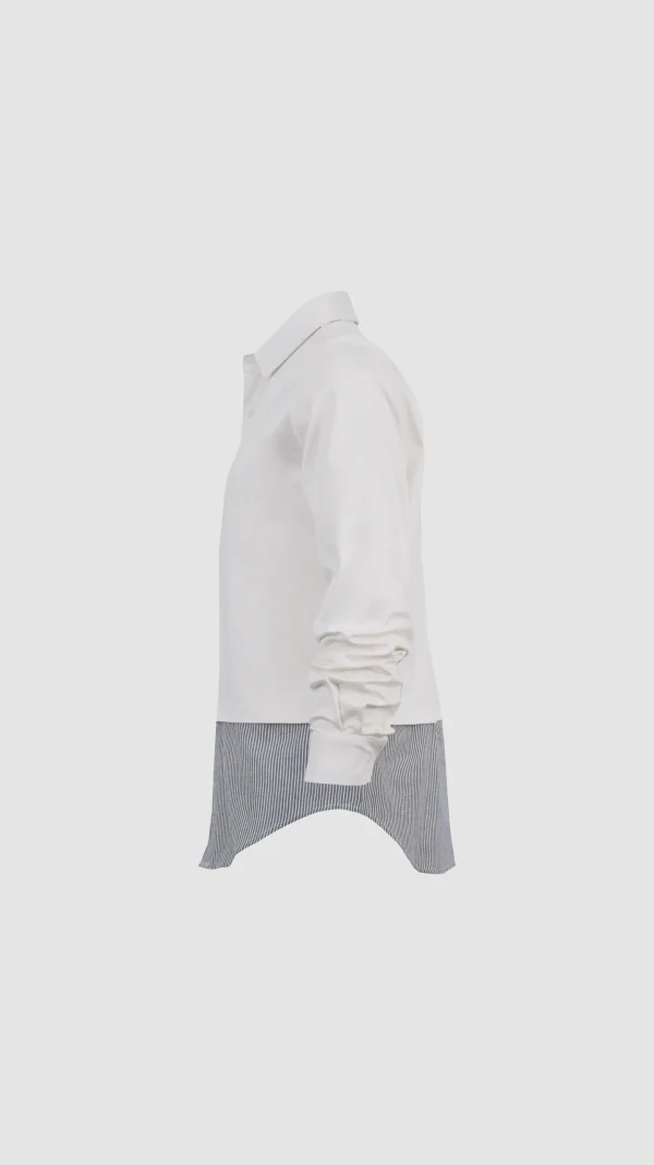 This stylish white shirt is perfect for any occasion, featuring eye-catching grey striped details that add a modern twist. Perfect for both casual outings and more formal occasions, it’s versatile enough to pair with jeans or tailored pants.