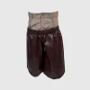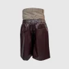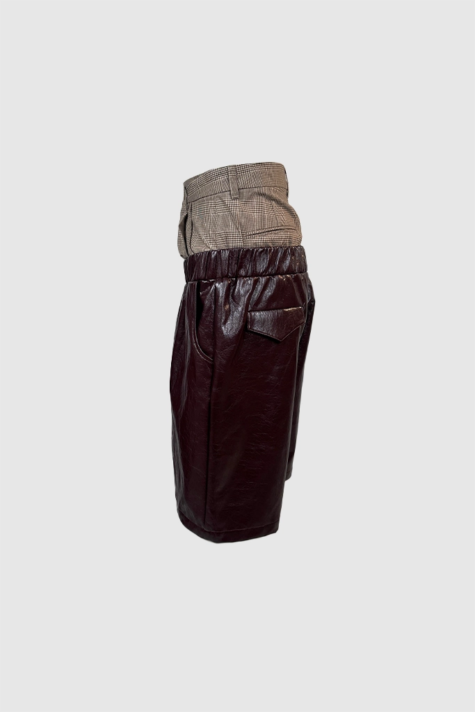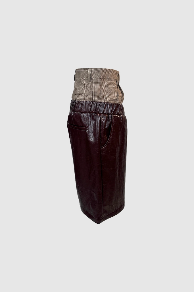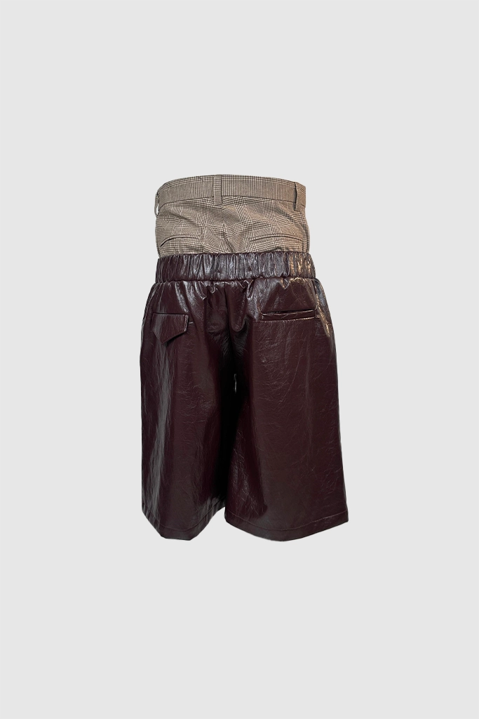 Eksperimen siluet terbaru dari XSML yang menggabungkan dua elemen kontradiktif menjadi satu kesatuan desain yang provokatif. Celana pendek ini menampilkan detail trompe l’oeil (ilusi optik) dengan panel pinggang bermotif plaid klasik yang menyerupai celana formal, dipadukan secara hibrida dengan celana bermaterial kulit sintetis.