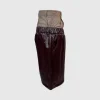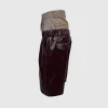 Warna burgundy yang dalam dan tekstur kulit yang mengkilap (glossy finish) memberikan kontras tajam terhadap motif kotak-kotak yang maskulin. Dengan potongan yang lebar dan pinggang elastis di bagian bawah panel plaid, celana ini menawarkan kenyamanan sekaligus pernyataan gaya yang tak tertandingi di jalanan kota.