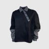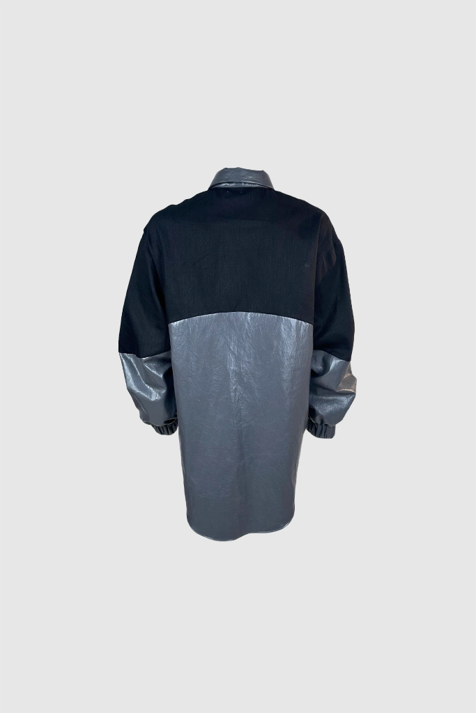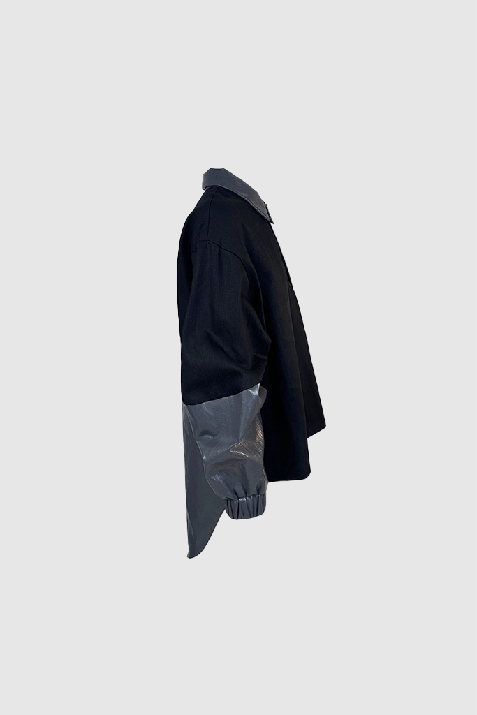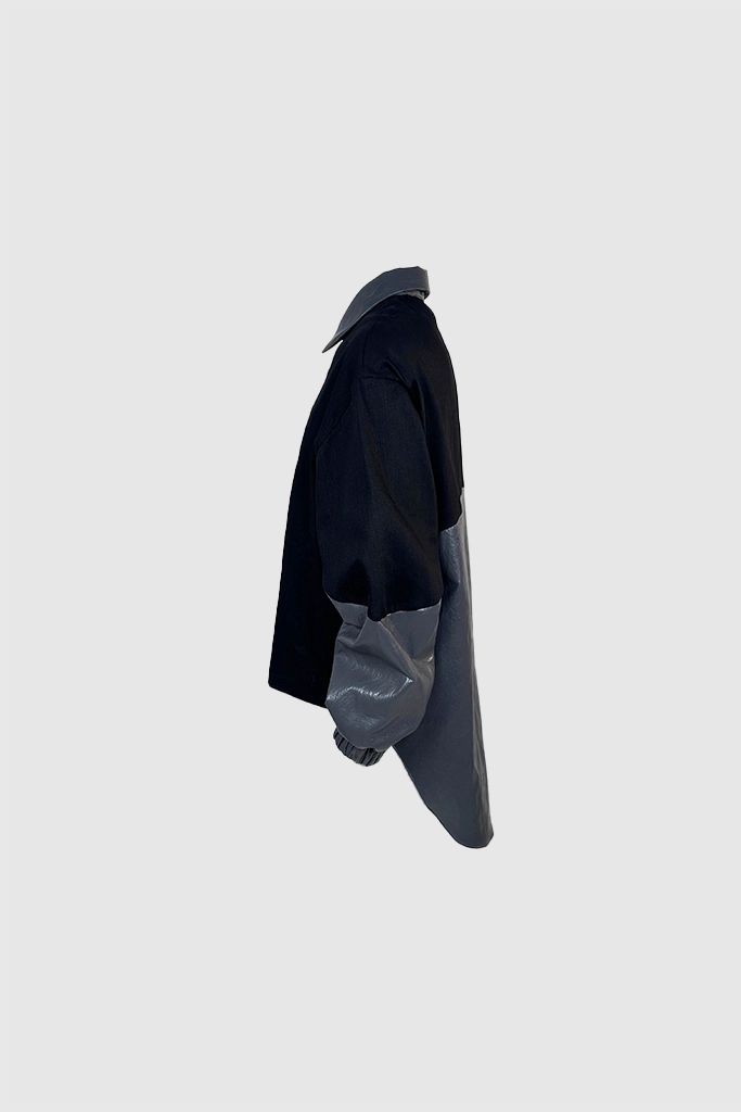 Evolusi dari gaya urban-utility, XSML menghadirkan atasan dengan desain hibrida yang berani. Polo shirt ini mengombinasikan material utama berwarna hitam pekat dengan aksen synthetic leather bertekstur pada bagian kerah, plakat kancing asimetris, dan panel lengan.