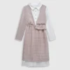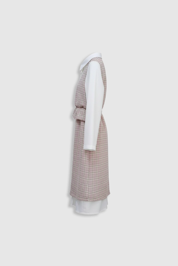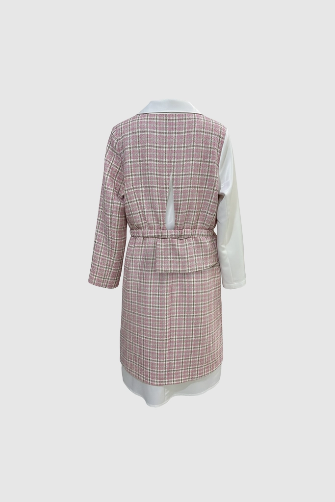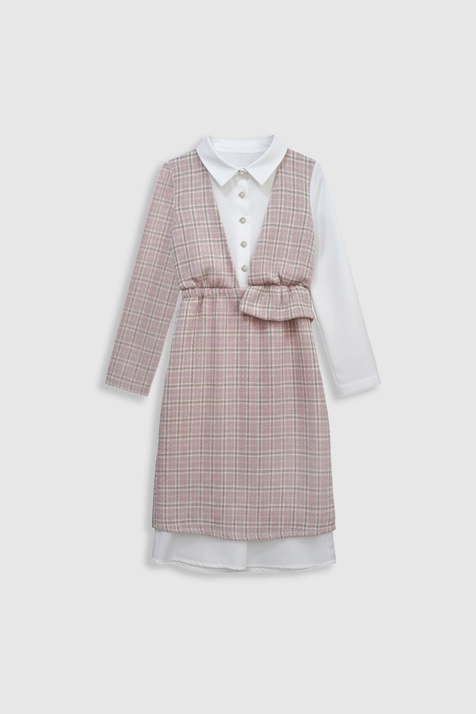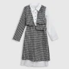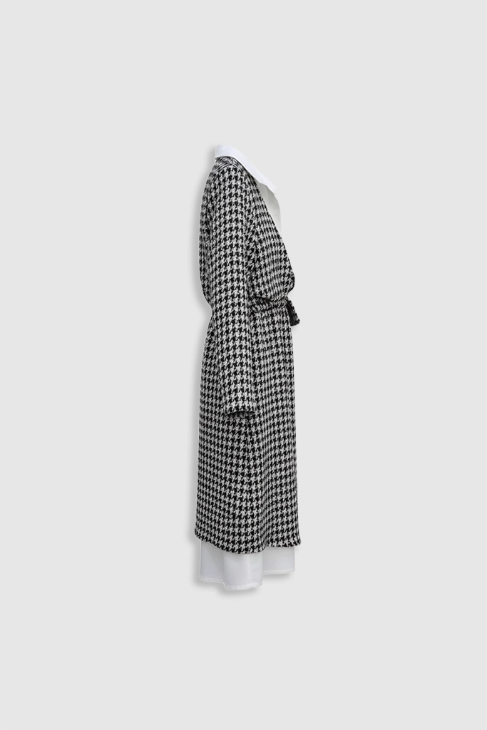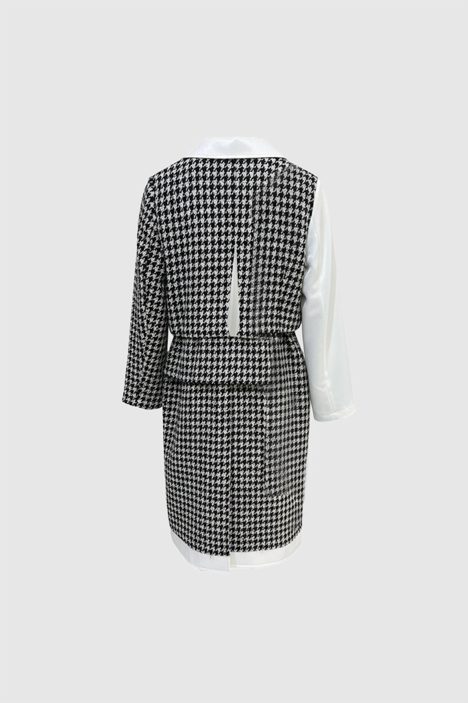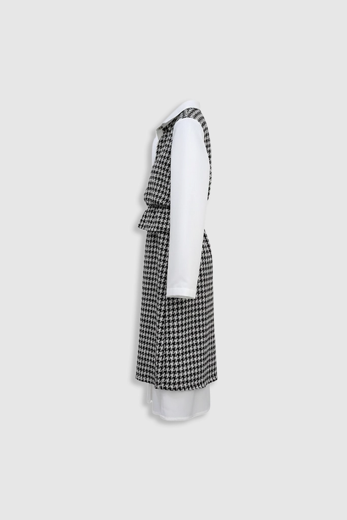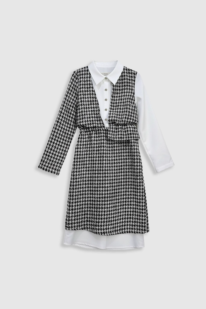 Unleash timeless sophistication with the 2-in-1 Houndstooth Chic Dress, a perfect statement piece for any occasion this season. This elegantly designed garment features the iconic black and white houndstooth pattern overlaid atop a crisp, long-sleeved white collared shirt, creating an instant layered look without the bulk. The beautifully tailored and cinched waist detailing ensures a highly flattering silhouette, making this dress the ultimate fusion of classic elegance, modern style, and effortless charm.