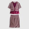 Add a touch of chic sophistication to your everyday look. Designed in a cropped silhouette, this piece blends classic tweed texture with a fresh, modern cut. The rich burgundy tones paired with white and blush plaid detailing create a timeless yet youthful appeal.