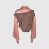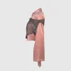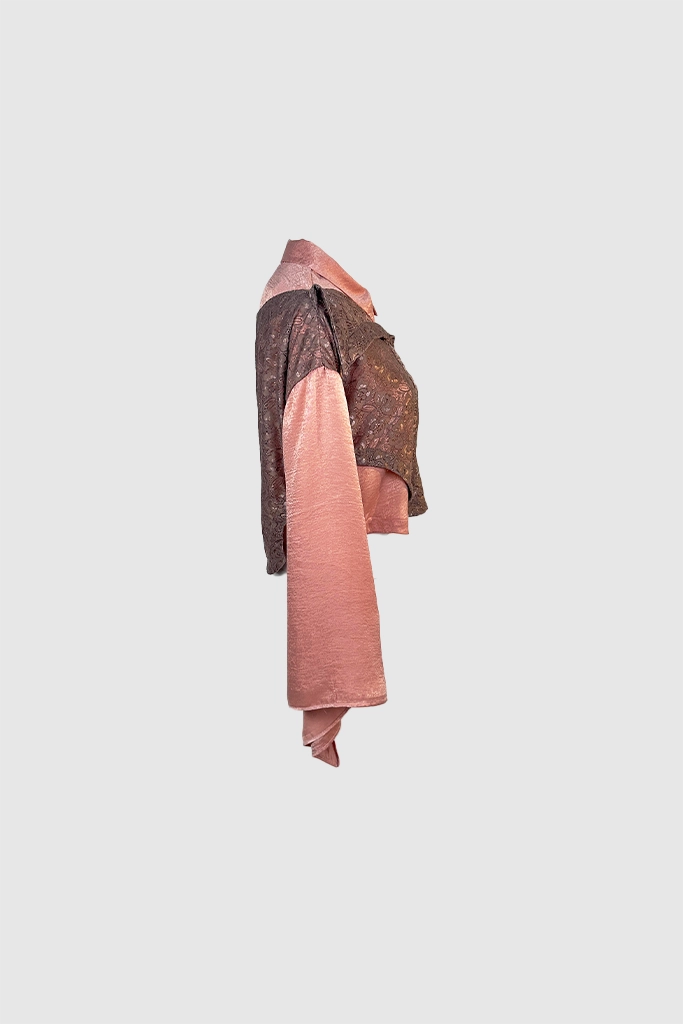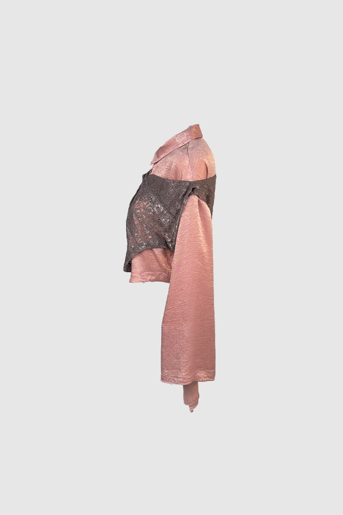 Potongan lengan yang melebar (flared sleeves) memberikan nuansa retro-modern, sementara perpaduan warna dusty rose dan aksen brokat gelap memberikan kesan feminin yang tangguh. Cocok bagi Anda yang ingin tampil beda namun tetap terlihat high-fashion dan terkurasi.